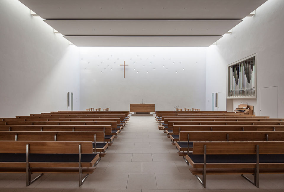 Die von einer ‘Lichtwolke’ durchzogene Altarwand ermöglicht, zusammen mit der Belichtung von oben, eine sich im Verlauf des Tages verändernde natürliche Lichtstimmung, die den schlicht gehaltenen Raum dezent belebt. In dem von äußeren Einflüssen geschützten Sakralraum wird so das natürliche Umfeld abstrakt spürbar, bei gleichzeitigem Rückzug und der Möglichkeit zur Besinnung.